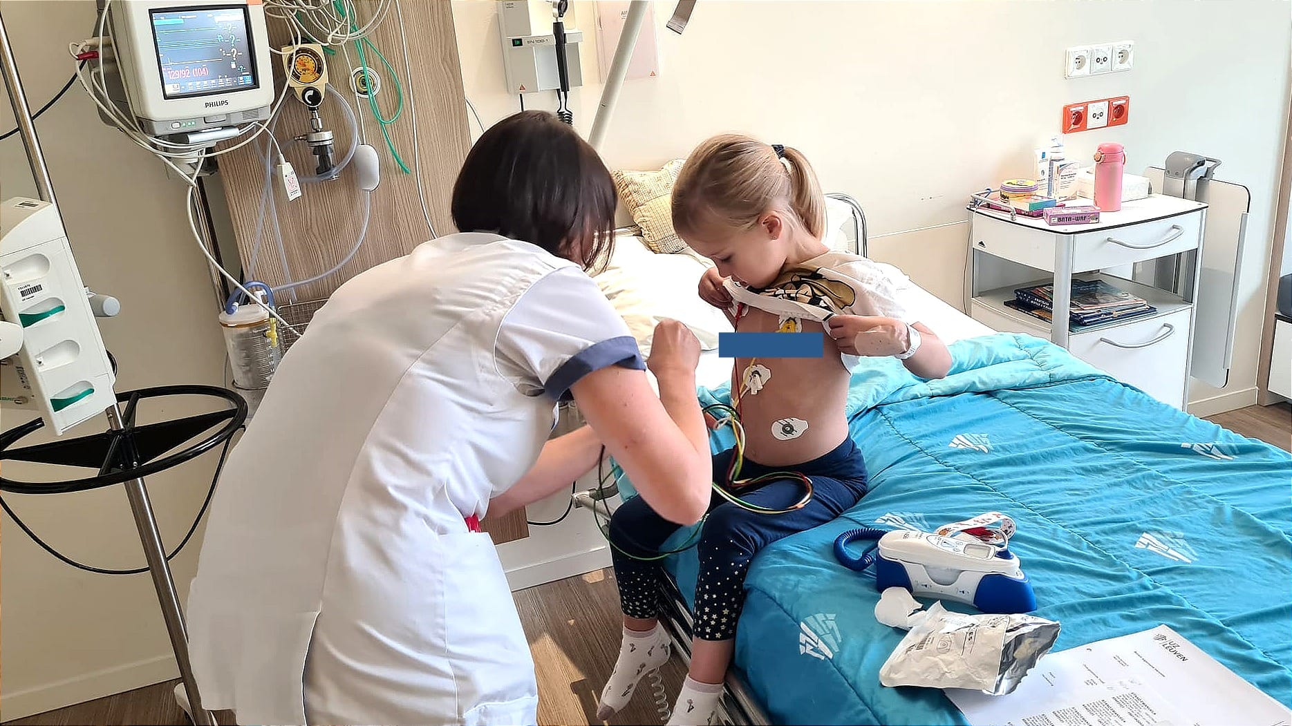 She cooperated - letting them attach the oximeter, pressure bracelet, and ECG electrodes, which she even wanted to put on her giraffe. The medical team was amazing, playing along. But she didn't want to lie down.