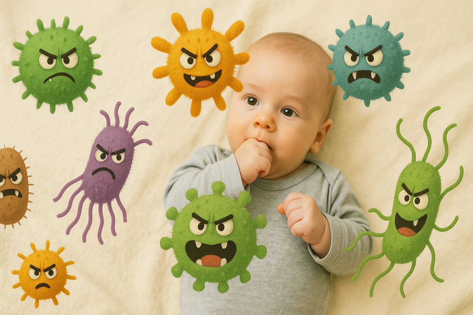 So, as soon as viral season started, I had to sharpen my mama bear claws and start fending off visitors - both visible and microscopic. At our home, you could find disinfectant almost in every drawer and on every shelf. Honestly, sometimes I'd catch myself waving my hand through the air, as if shooting away a fly, imagining mean-looking little furry round viruses floating happily around, ready to dock on my baby's hands. And the moment she'd suck on them, they'd anchor themselves inside her nose or mouth.